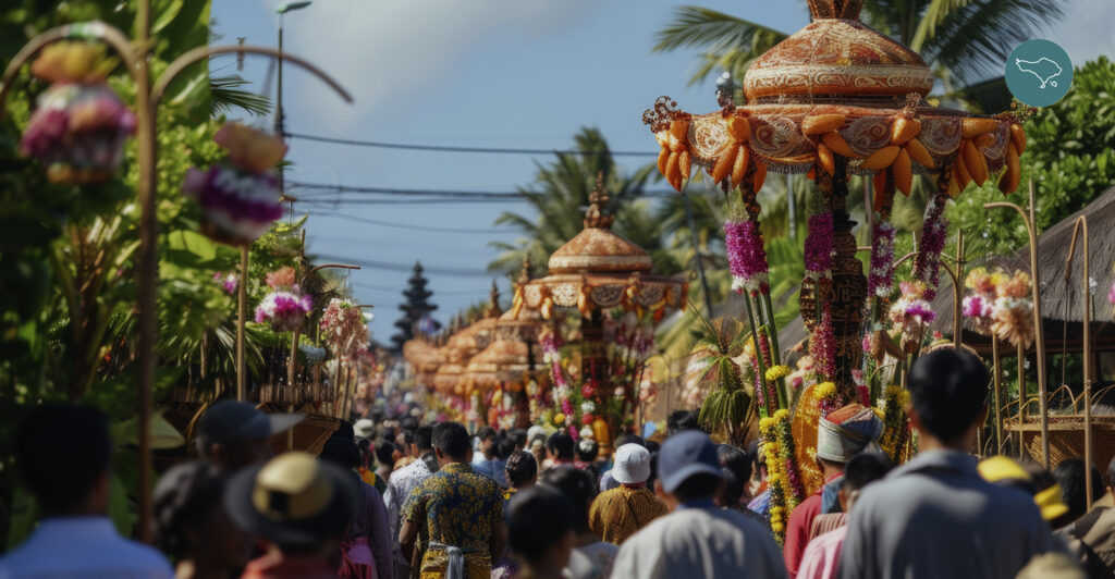 A major Balinese Hindu celebration honoring ancestral spirits. Penjor bamboo decorations line the streets.